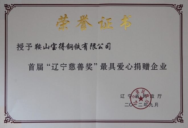 2012年9月,公司荣获首届“辽宁慈善奖”最具爱心捐赠企业。