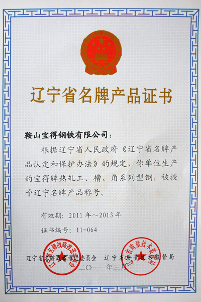 2011年3月,公司生产“宝得”牌热轧工、槽、角系列型钢,被辽宁省名牌战略推进委员会、辽宁省质量技术监督局授予“辽宁省名牌产品”称号。